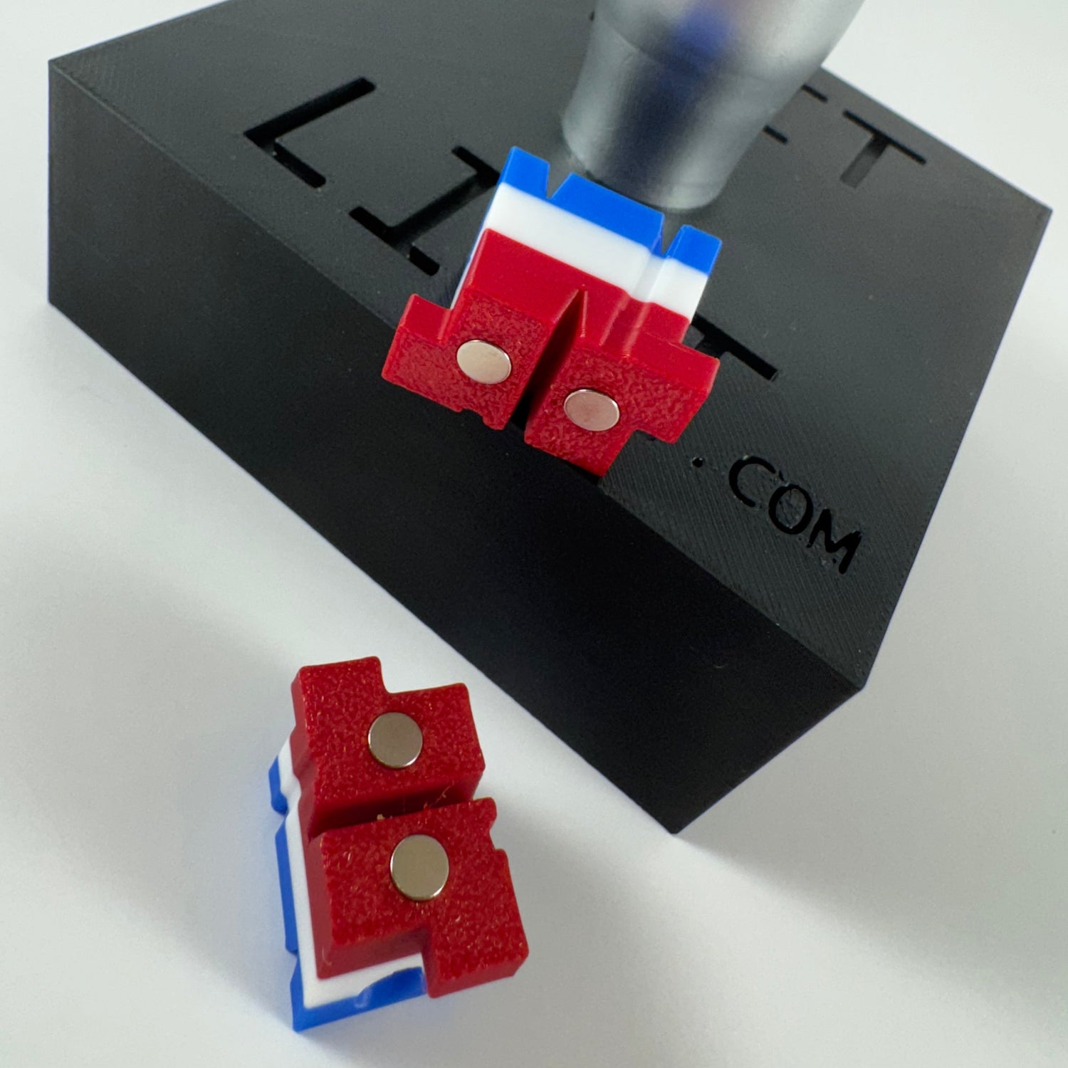 Two (2) pressed fit 3/16″ x 1/16″ rare-earth (Neodymium Iron Boron in Grade N52) magnets in the bottom of the base to ensure secure attachment.